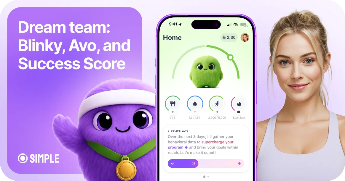 But even Blinky knows he can’t do it all. That’s why he works alongside your Simple Success Score™—the part of the app that tracks your calories, nutrients, workouts, hydration, steps, and fasts—to show how your choices add up across the day and how close you are to your goals.